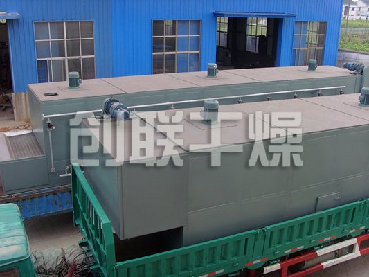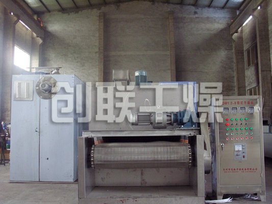 物料由加料器均勻地鋪在網(wǎng)帶上,網(wǎng)帶一般采用12-60目不銹鋼絲網(wǎng),由傳動(dòng)裝置拖動(dòng)在干燥機內移動(dòng)。干燥機由若干單元組成,每一單元熱風(fēng)獨立循環(huán),部分尾氣由專(zhuān)門(mén)排濕風(fēng)機排出,廢氣由調節閥控制,熱氣由下往上或由上往下穿過(guò)鋪滿(mǎn)物料的網(wǎng)帶完成熱量與質(zhì)量傳遞的進(jìn)程,帶走物料水份。網(wǎng)帶緩慢移動(dòng),運行速度可根據物料溫度自由調節,干燥后的成品連續落入收料器中。上下循環(huán)單元根據用戶(hù)需要可靈活配備,單元數量亦可根據需要選取。